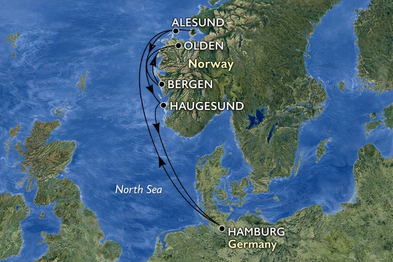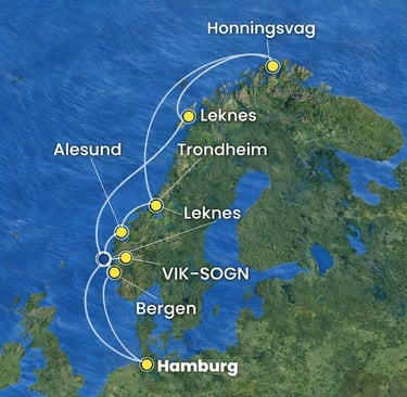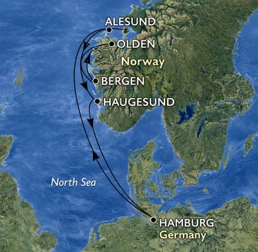 El punto culminante del viaje es Honningsvåg, puerta de acceso al Cabo Norte, uno de los lugares más septentrionales de Europa, donde el sol de medianoche y los paisajes árticos ofrecen una experiencia inolvidable. Tras recorrer la costa noruega, el crucero regresa a Hamburgo, cerrando una ruta que combina aventura, naturaleza y navegación escénica.
