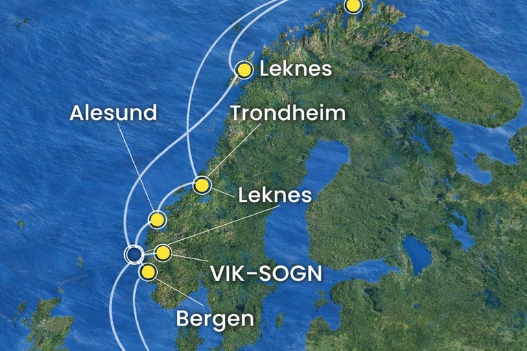 La primera escala es Bergen, puerta de entrada a los fiordos y famosa por su puerto histórico y su entorno natural. El itinerario continúa hacia la región de Vik-Sogn, donde el crucero se adentra en zonas de fiordos profundos rodeados de montañas y cascadas.