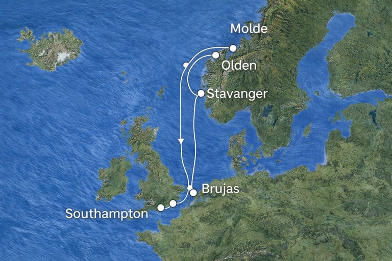 Este itinerario ofrece una combinación perfecta de ciudades históricas y paisajes naturales del norte de Europa. La travesía comienza en Southampton, desde donde el barco navega por el canal de la Mancha y el mar del Norte rumbo al continente europeo.