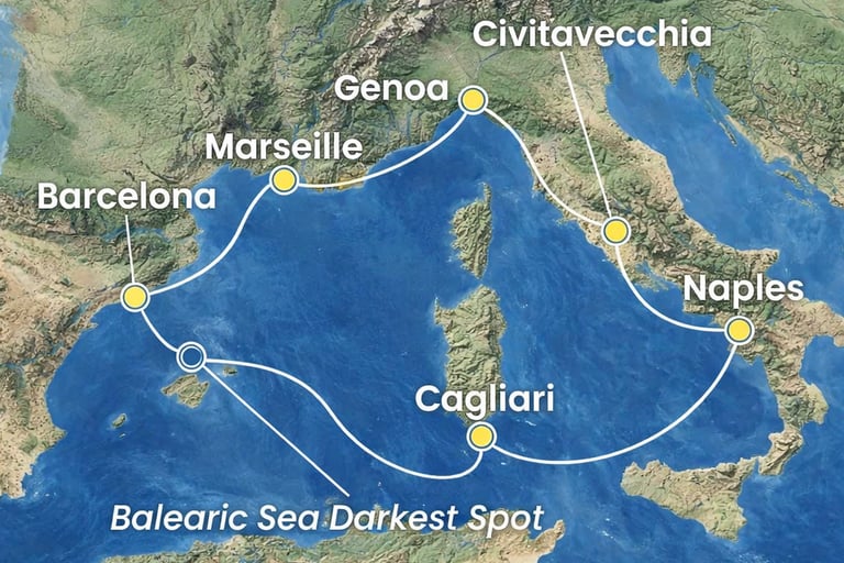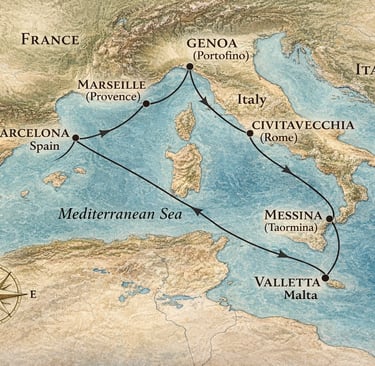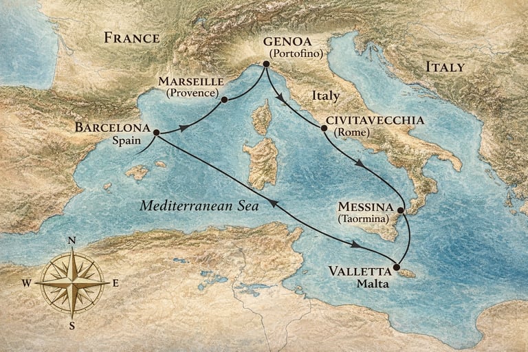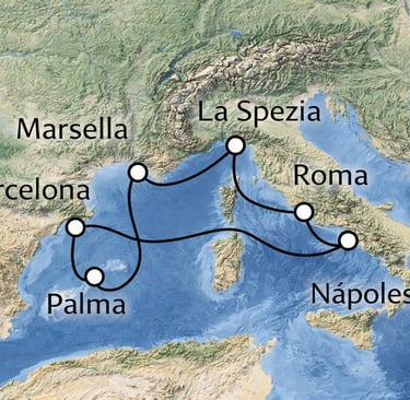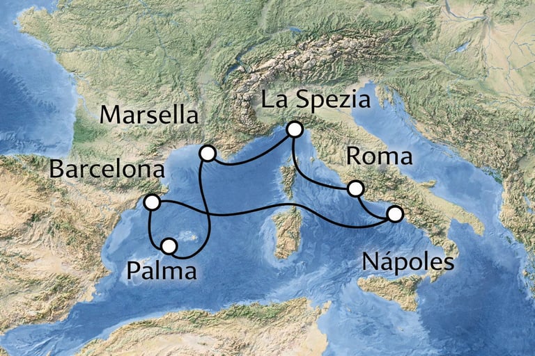 El itinerario comienza en Barcelona y continúa hacia Marsella, combinando cultura mediterránea y tradición portuaria. La ruta sigue por la costa italiana con escalas en Génova y Civitavecchia, el punto de acceso ideal para descubrir Roma. El viaje prosigue hacia Nápoles, llena de historia y carácter, antes de cruzar el Mediterráneo hasta Cagliari, en la isla de Cerdeña, una escala diferente y auténtica.